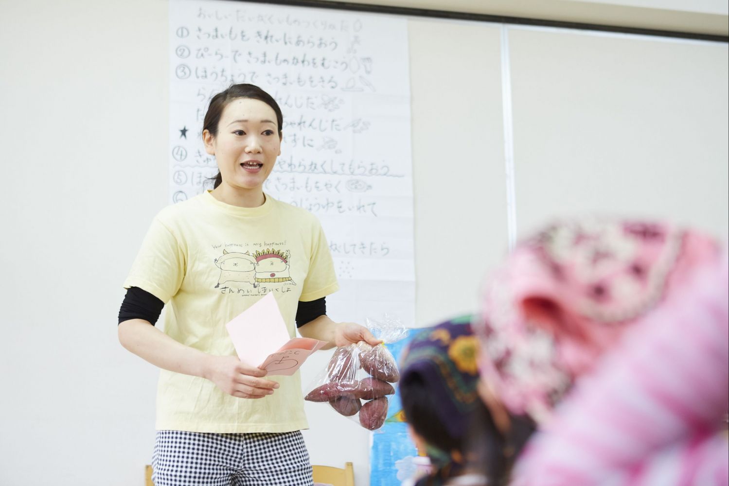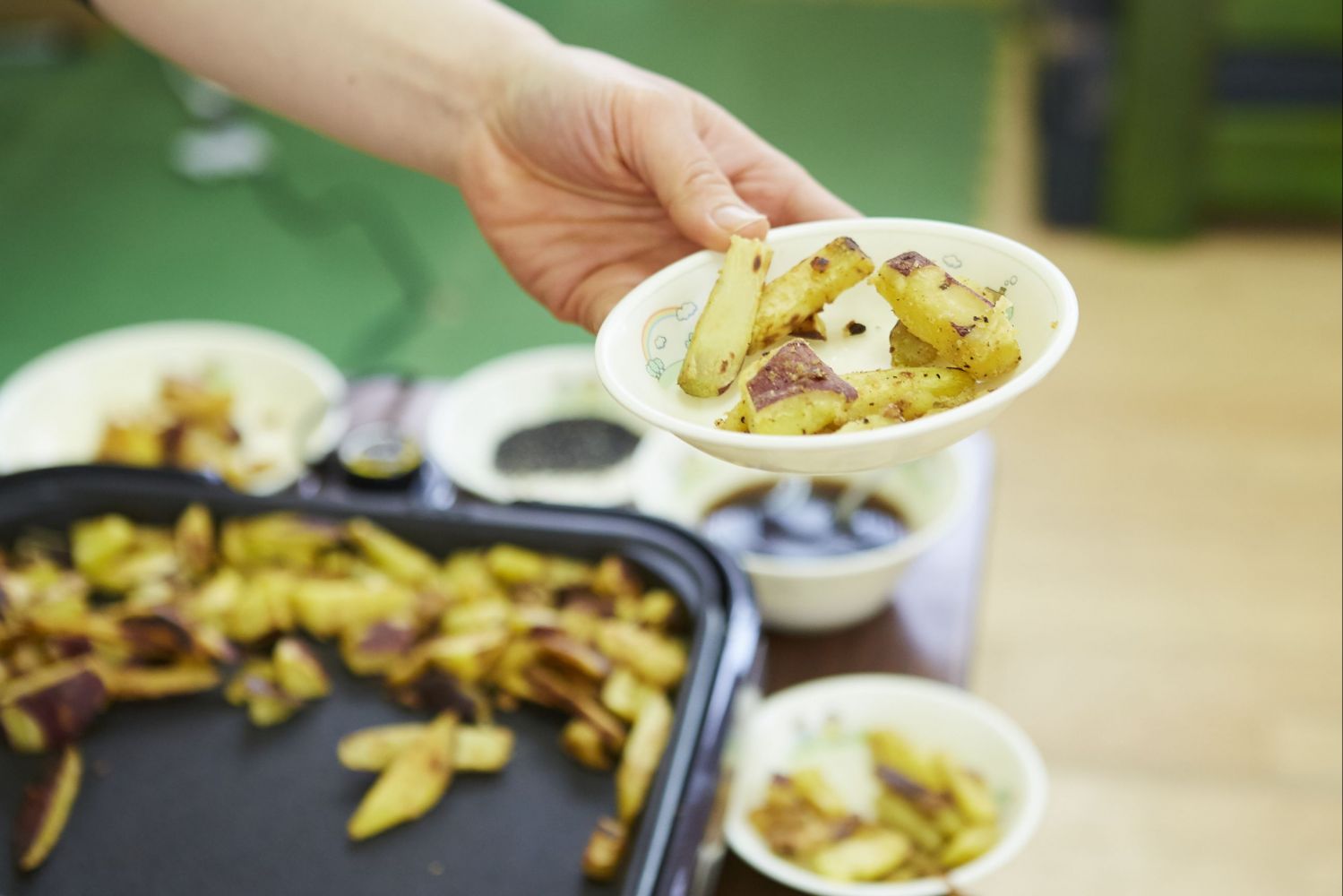 その企画や子どもたちへのお話も彼女たちの仕事のひとつ。この日の収穫野菜は“さつまいも”。さつまいもを食べると“どうしておならがでるのか”“おならがくさいのはどうして”など楽しいテーマを問題形式で投げかけ、答えさせながら、わかりやすく子どもたちと考えていく。先生と一緒に調理し、目の前で美味しそうな香りを放つ“大学いも”に子どもたちは興味津々で、先生の質問にも競うように手を挙げ、大きな声で答えてくれる。
