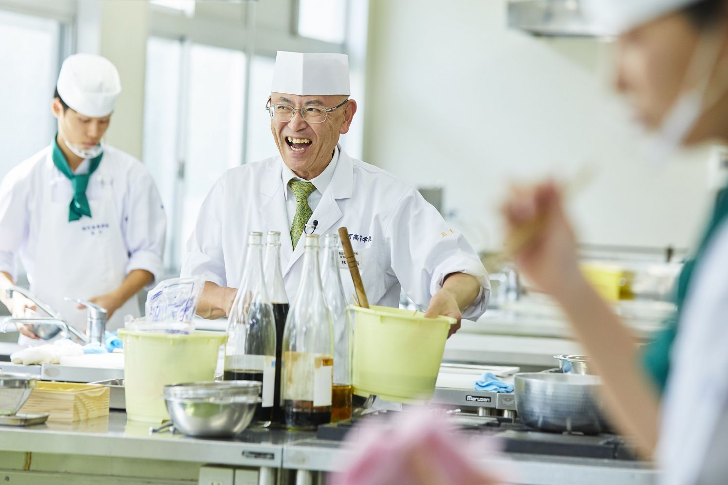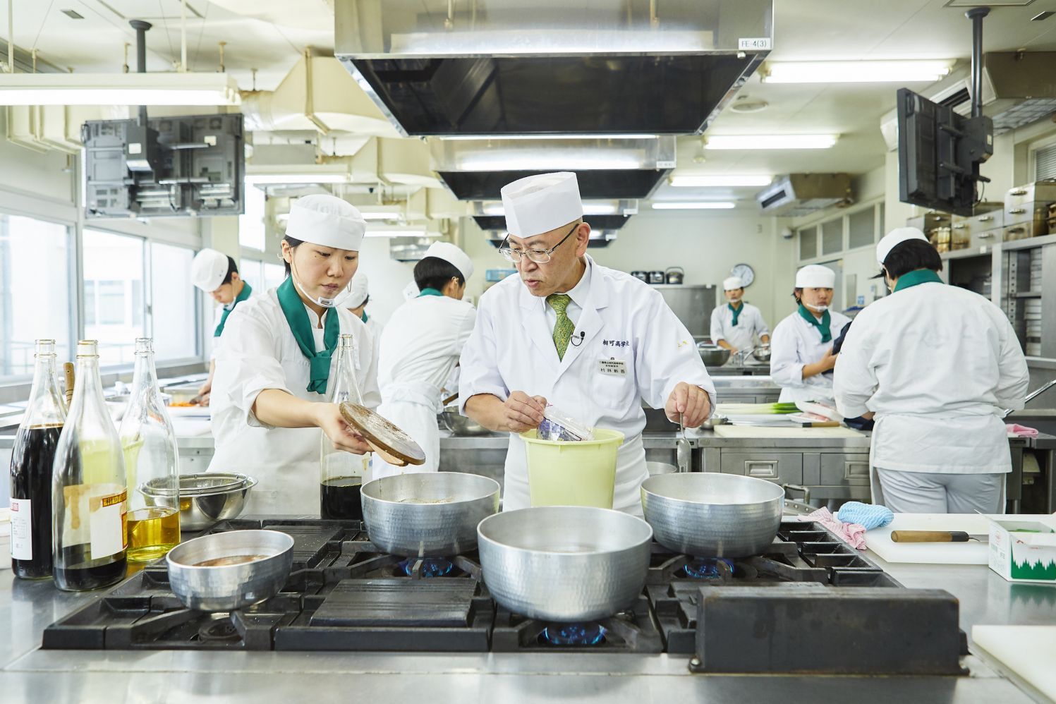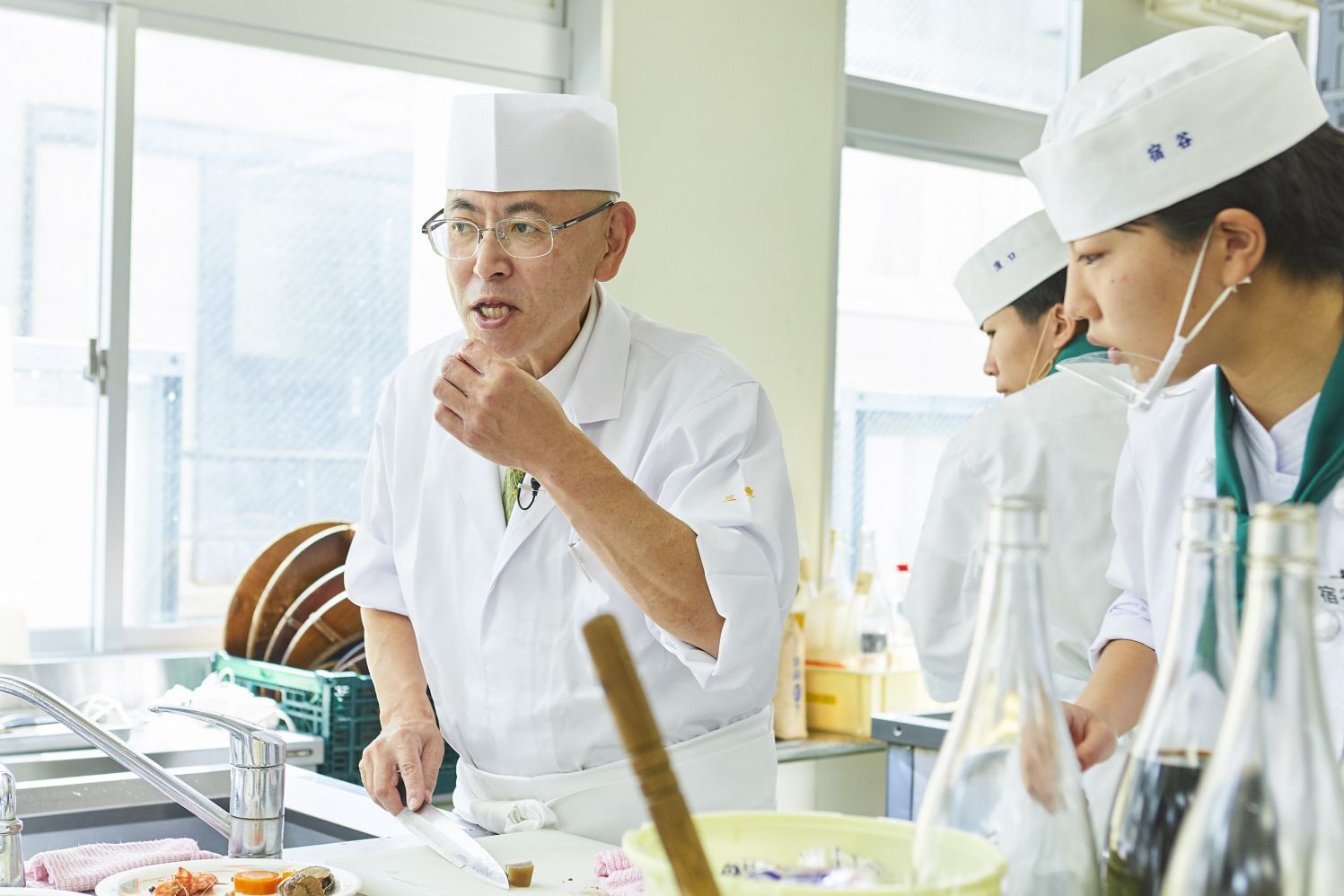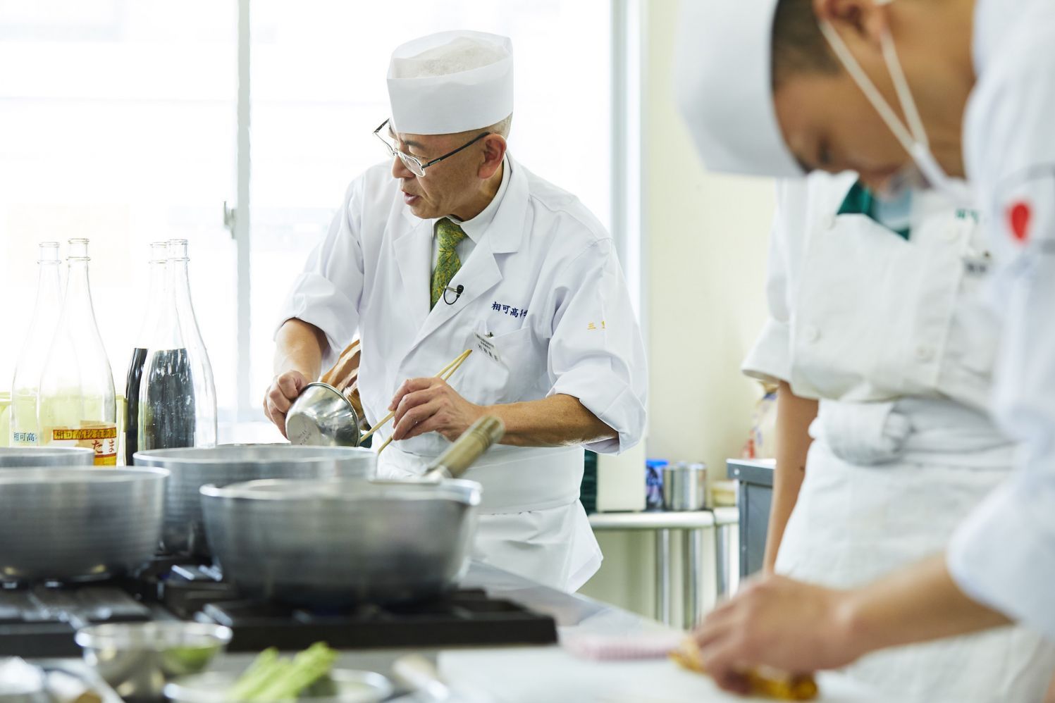 教壇に立つ先生が今何をしてほしいのか。助手には調理技術だけでなく、その場の状況をとっさに考えて行動できる、俊敏な判断力と気配りが求められる。