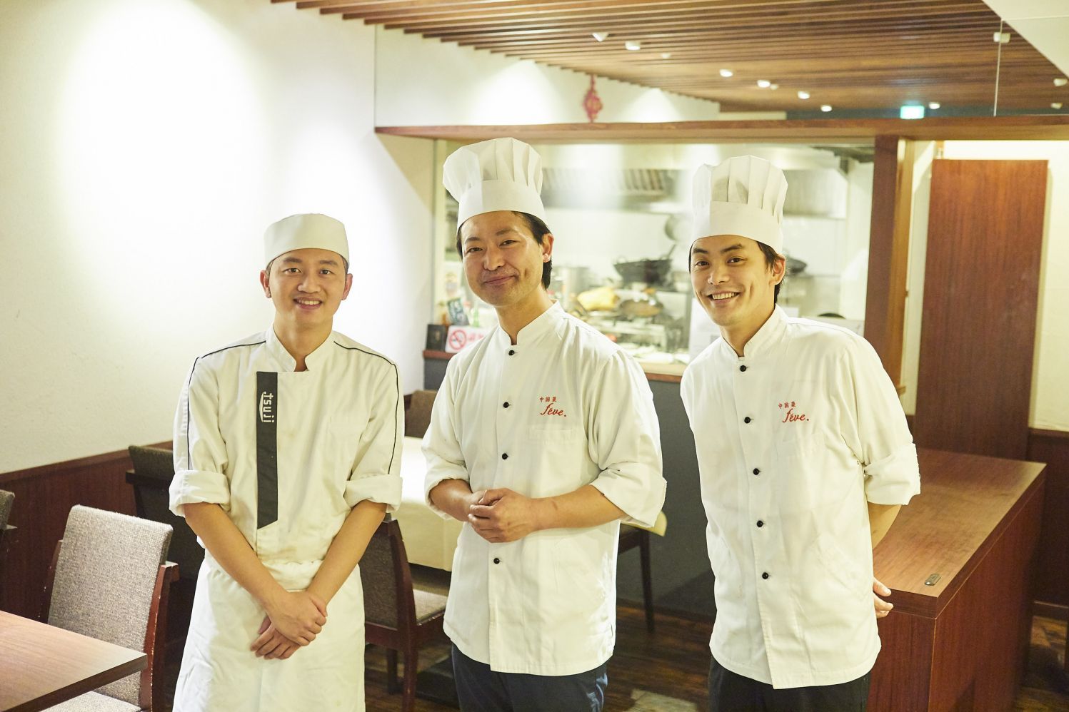 畑川 豊さん(中央)、岩佐 進冴さん(右 辻󠄀調理師専門学校2007年卒・辻󠄀調理技術研究所中国料理研究課程2008年卒 元辻󠄀調グループ教員)、楊 詠竣 YANG YUNG CHUNさん(左 台湾籍留学生 辻󠄀製菓専門学校から2021年4月に新卒入店予定)